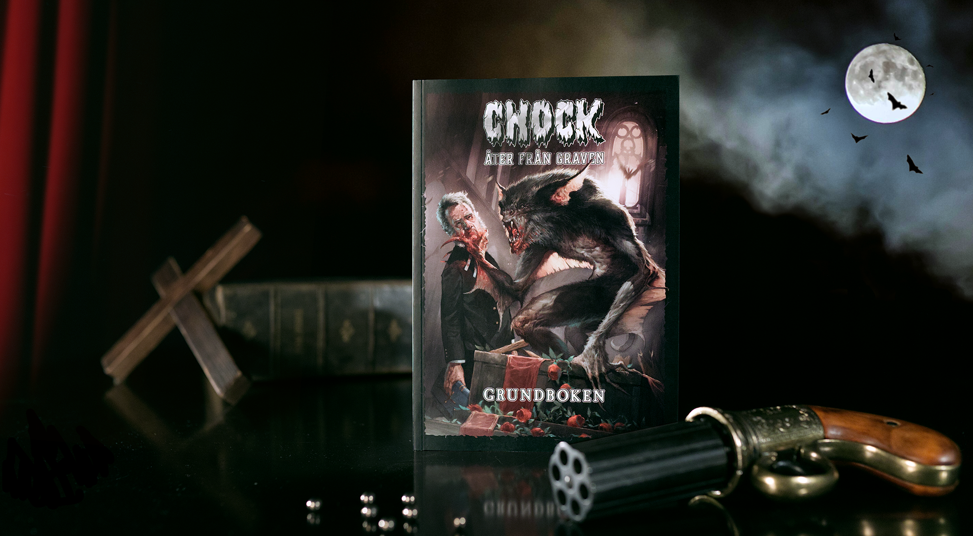 Chock: Åter från graven är ett skräckrollspel där man spelar Medvetna: en liten utvald skara som insett att monster finns. Man lämnar sina gamla liv bakom sig, axlar rollen som monsterjägare och samlas i hemliga sällskap för att öka sina chanser att överleva. Chock är rollspelet för spelgruppen som vill uppleva den filmiska känslan av att vandra över en öde hed – med ett jaktgevär i ena handen och en uråldrig bok i den andra – för att möta nattens fasor öga mot öga.